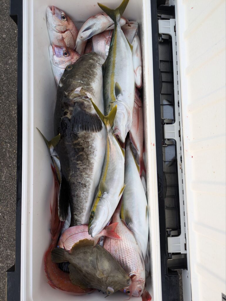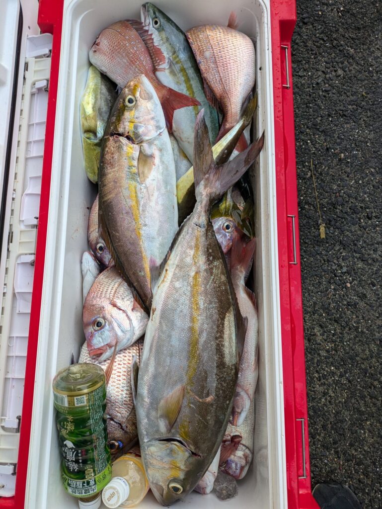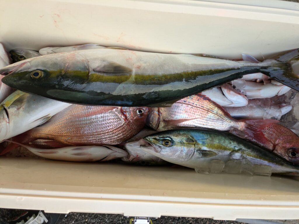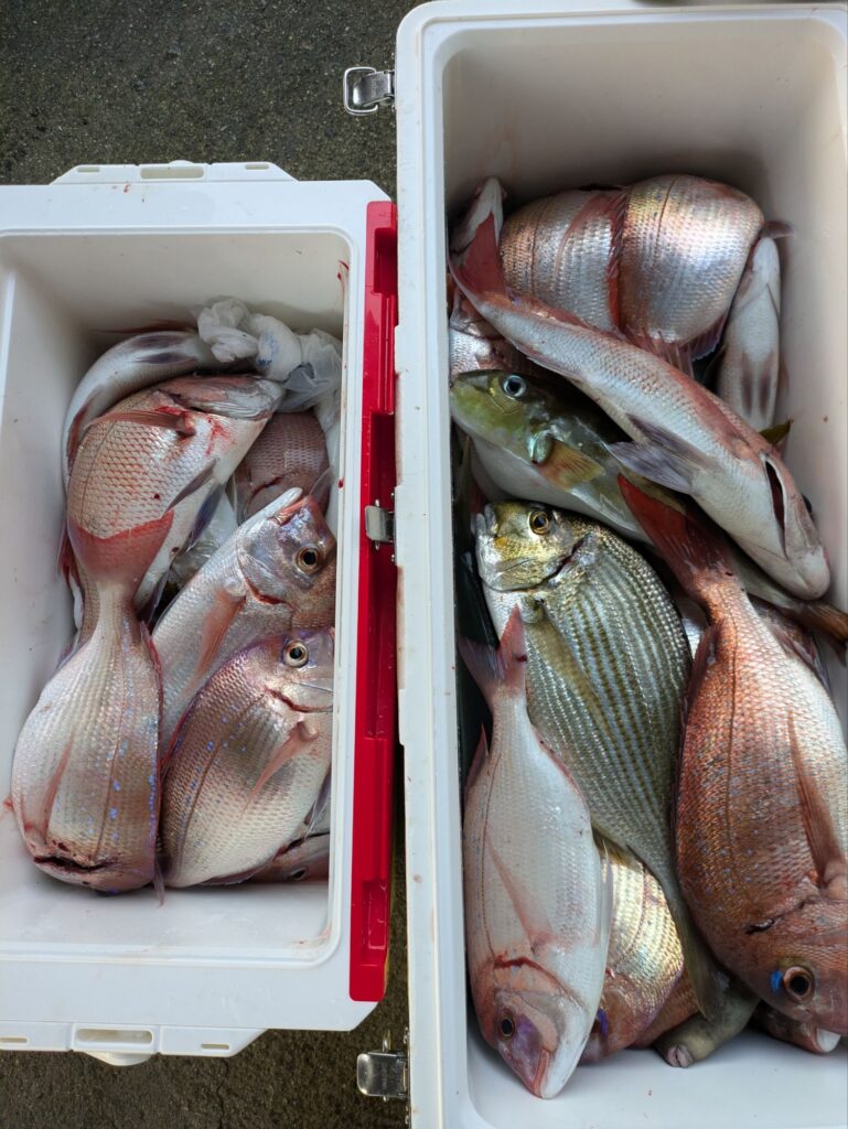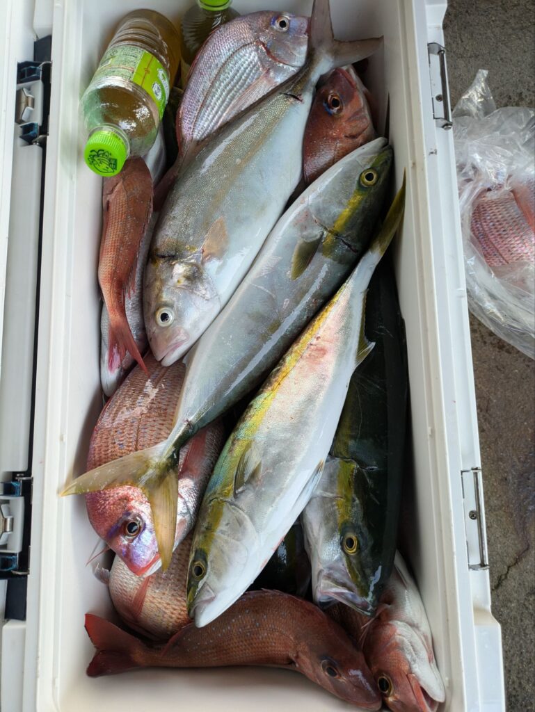 午後便でウタセマダイに出船しました。海岸近くは台風からのうねりが高かったが沖へ出ると波は無く魚も良く釣れた。