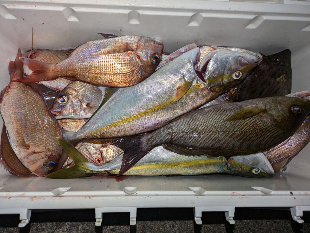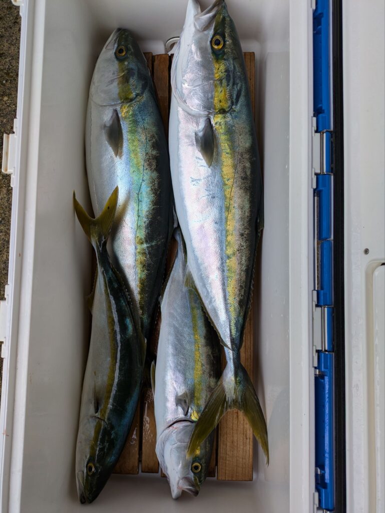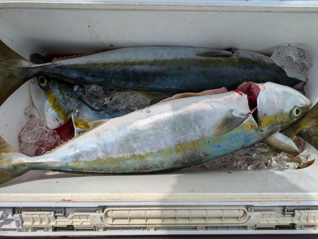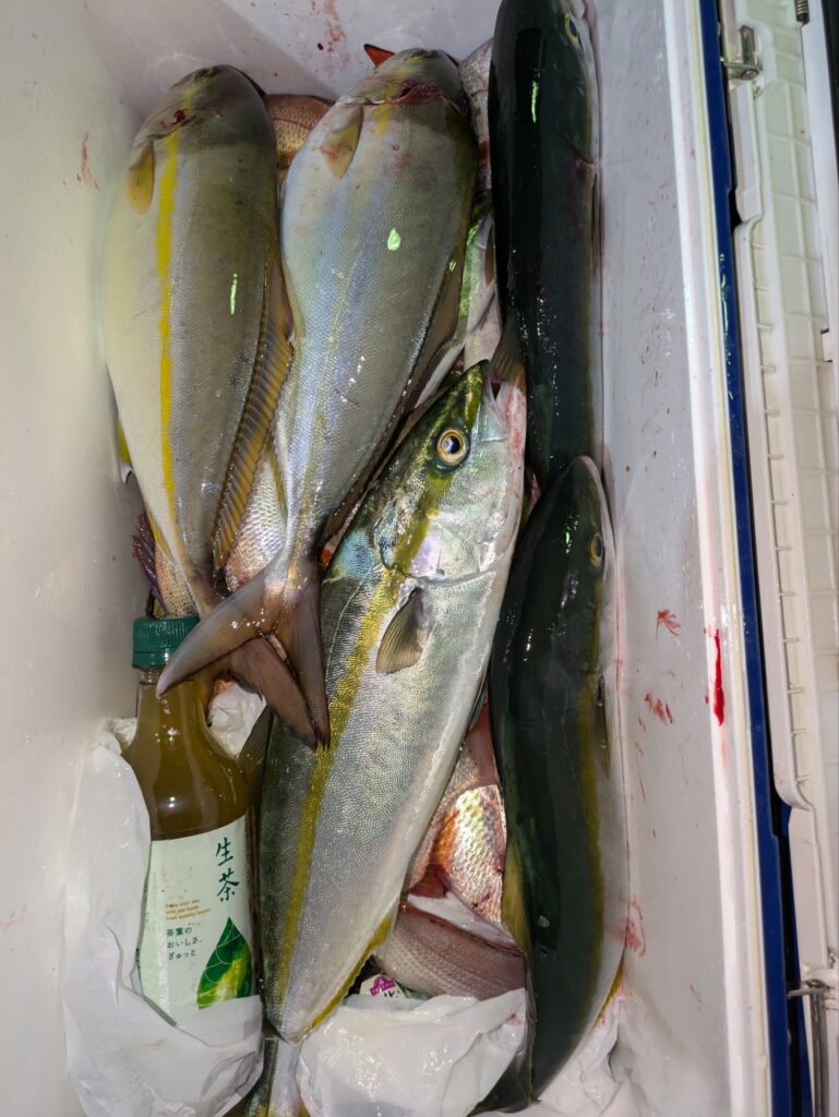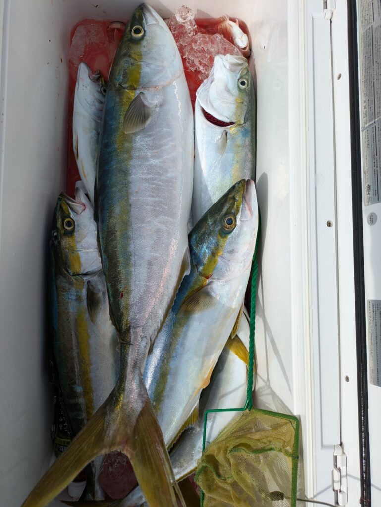 朝のタテ釣りはアジのベイトで大ハマチが全員に釣れて多い人で4本とハマチ。昼便のウタセマダイは初めは鯛を釣ってからカンパチ狙い。日没前にハマチとカンパチが回遊して来たが長続きしなかった。日曜の朝便の立て釣りは今2名で空きはたくさん有ります希望の方は連絡ください
