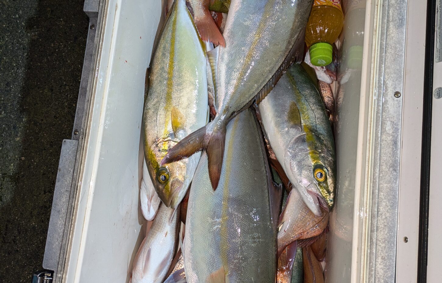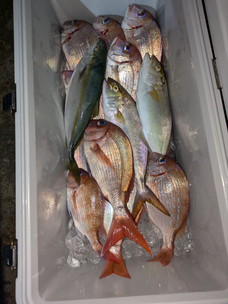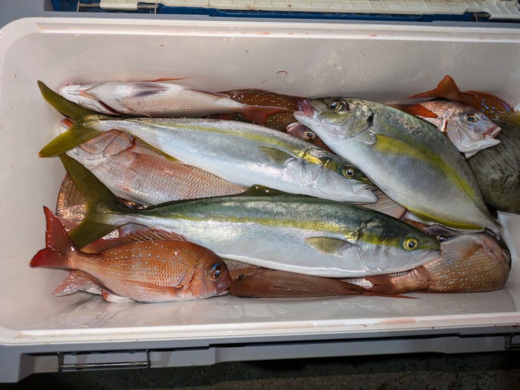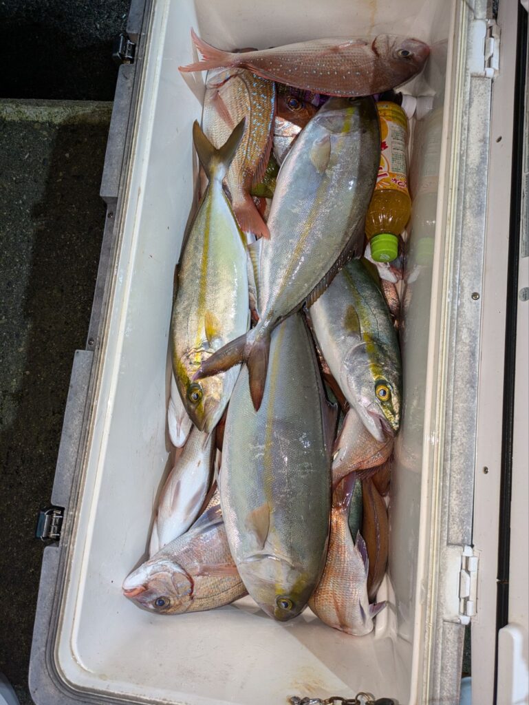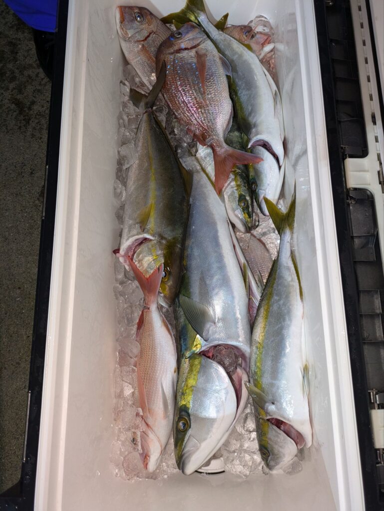 昼便でウタセマダイに出船。チダイやマダイ、シオ、ハマチ、大ハマチなどボチボチ釣れました。