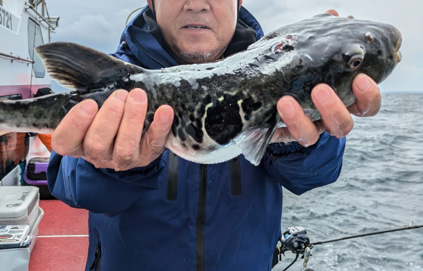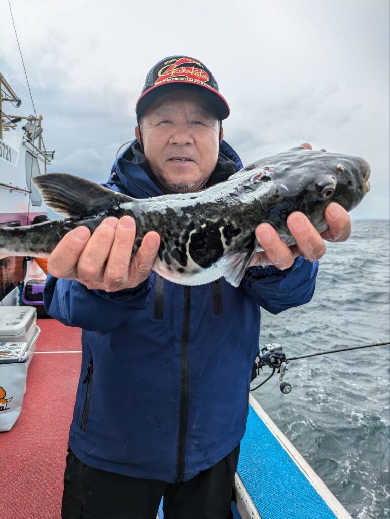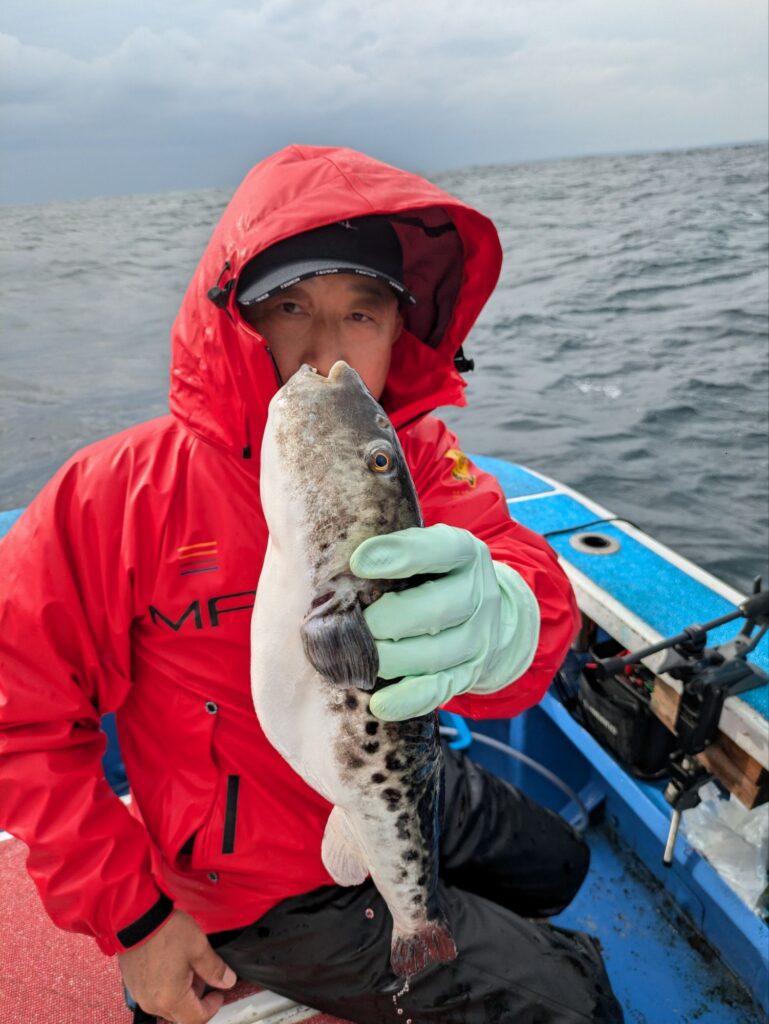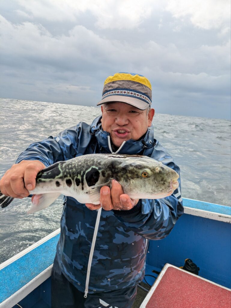 朝便でトラフグ釣りに出船。アタリが少なく釣れたポイントで粘って4匹の釣果。他にサバフグも。波が高く釣りづらかった。
