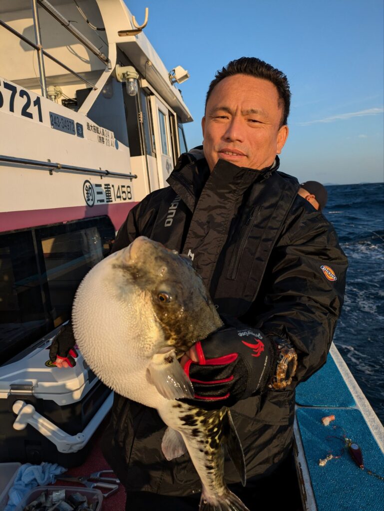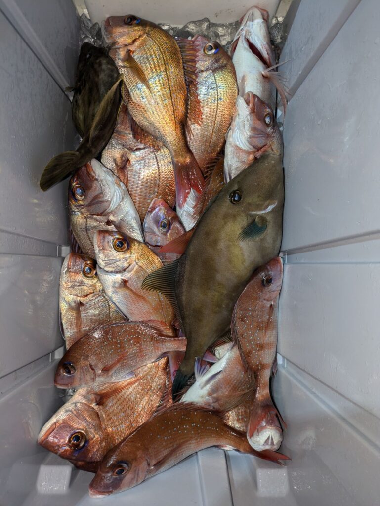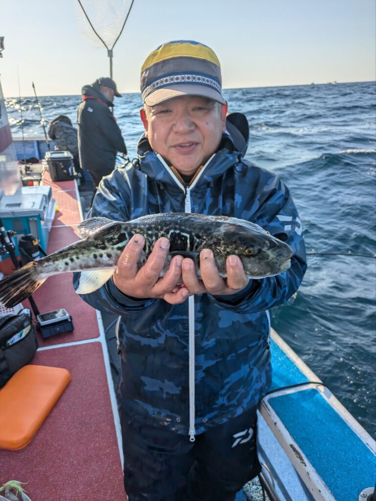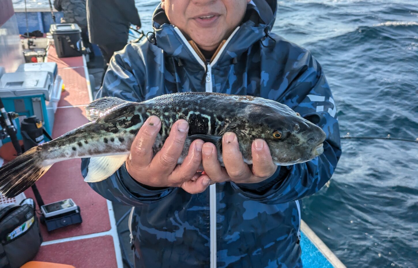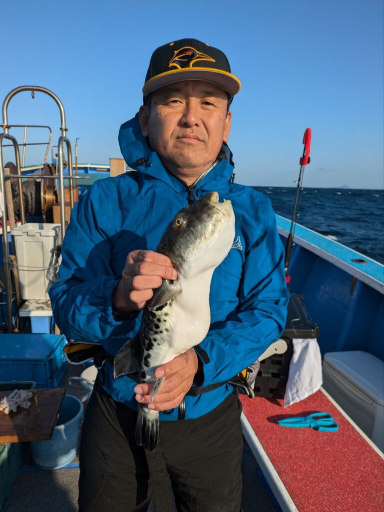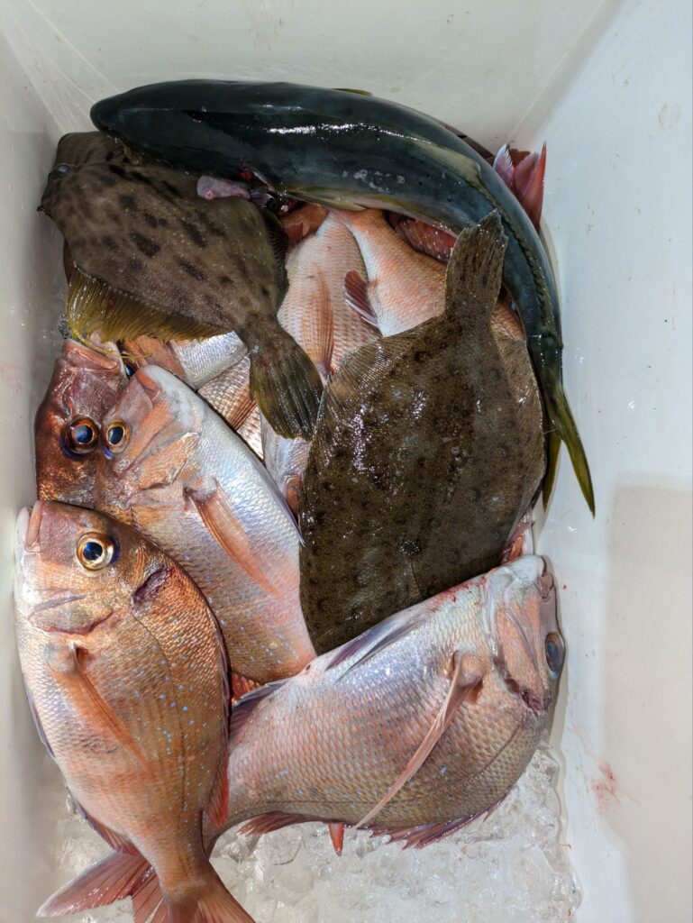 朝のトラフグは船中10匹の釣果。昼からのウタセマダイは風が強かったので近場を狙って真鯛やチダイを釣ってました。