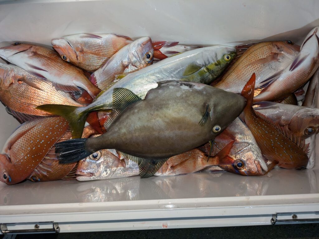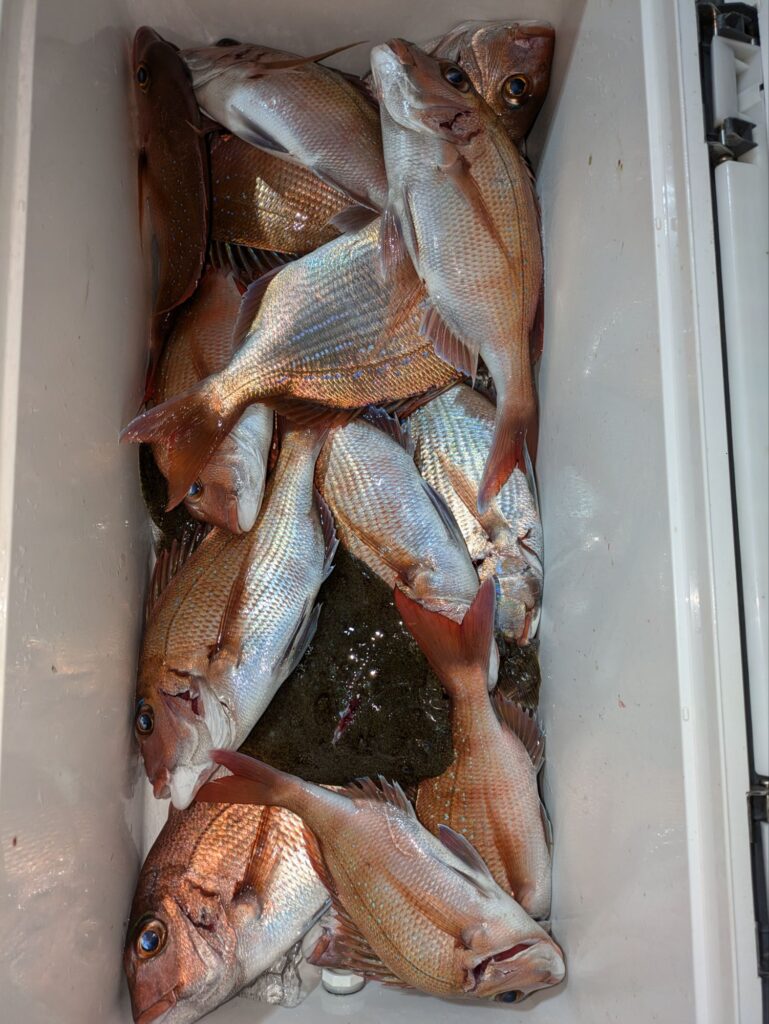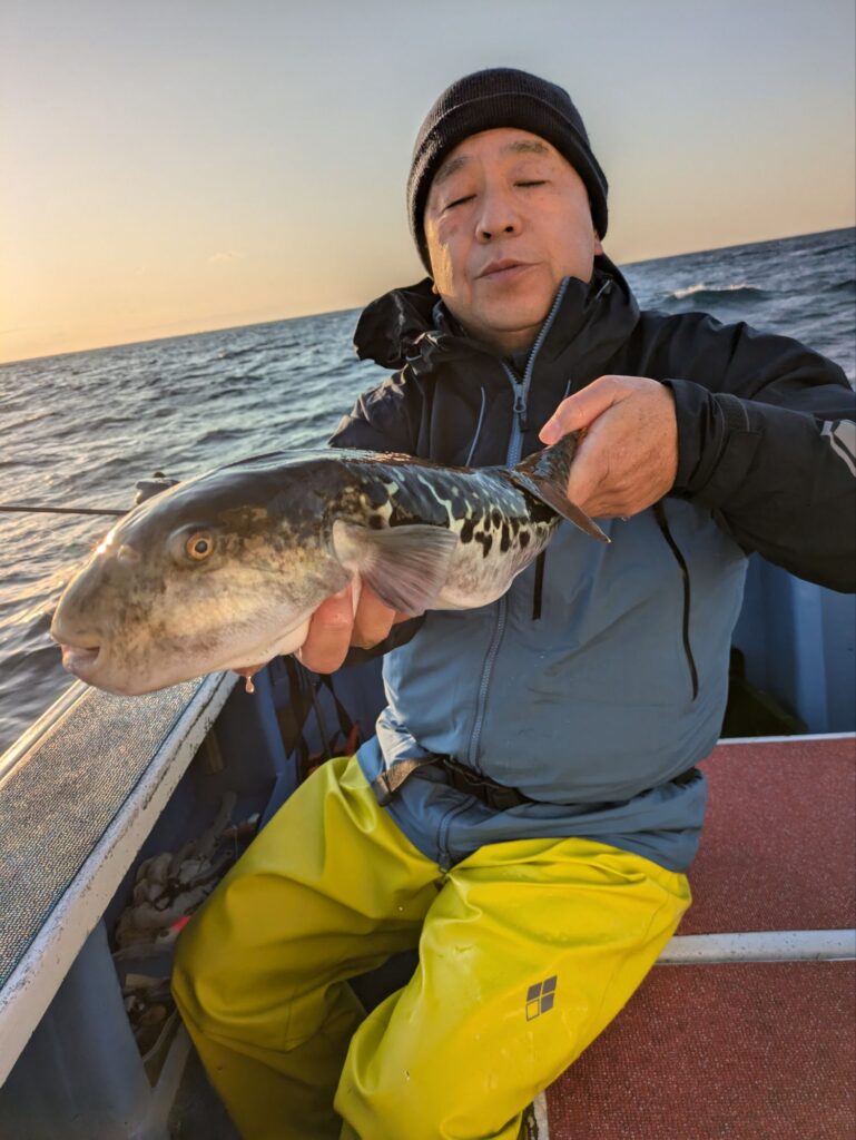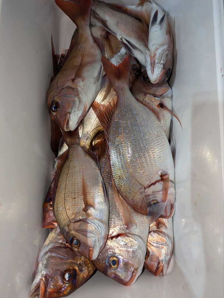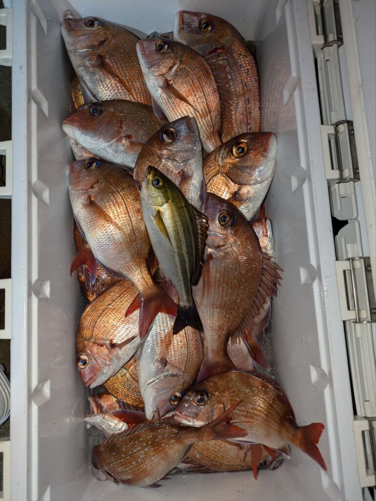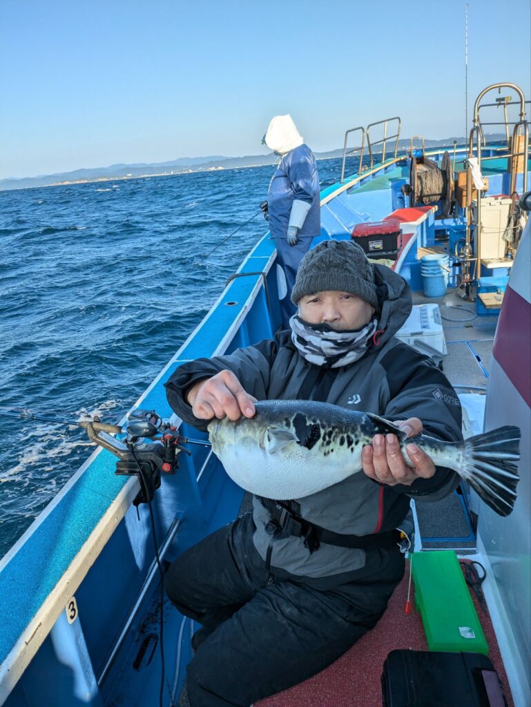 朝のトラフグは船中10匹の釣果。昼からのウタセマダイは風が強かったので近場を狙って真鯛やチダイを釣ってました。