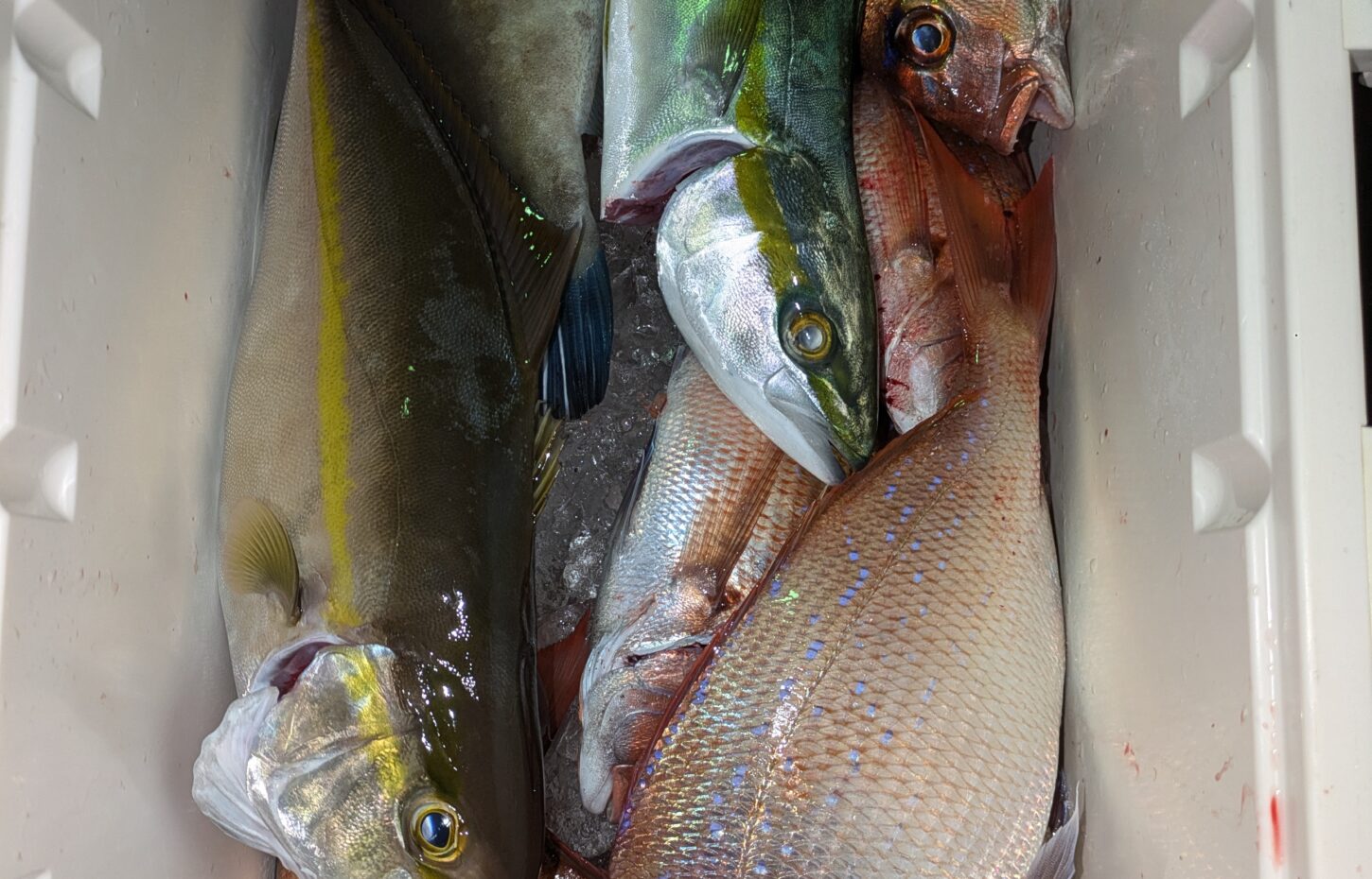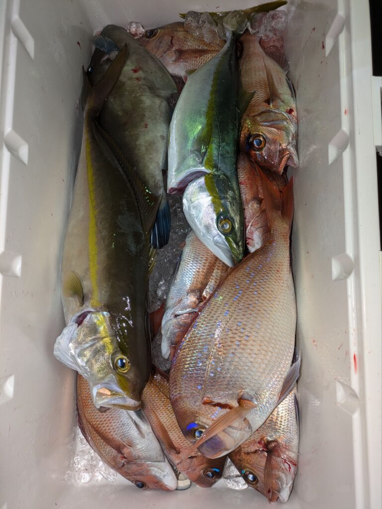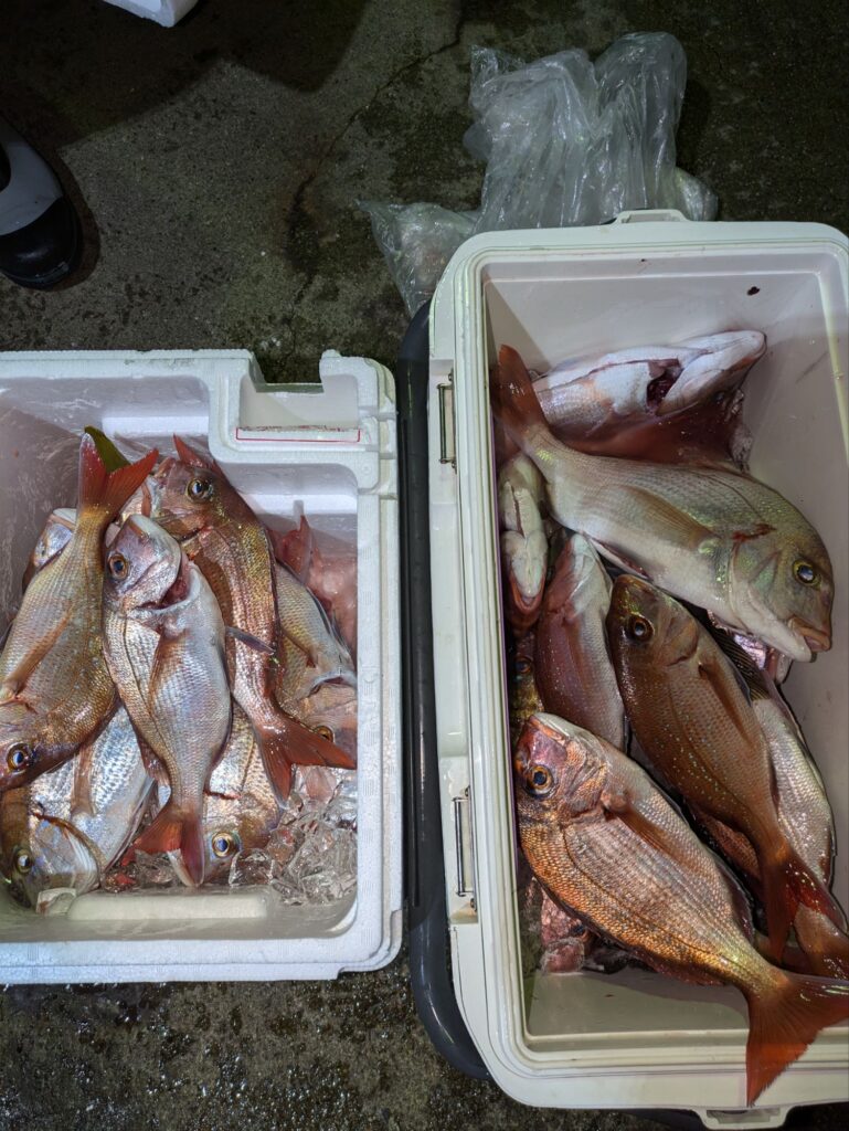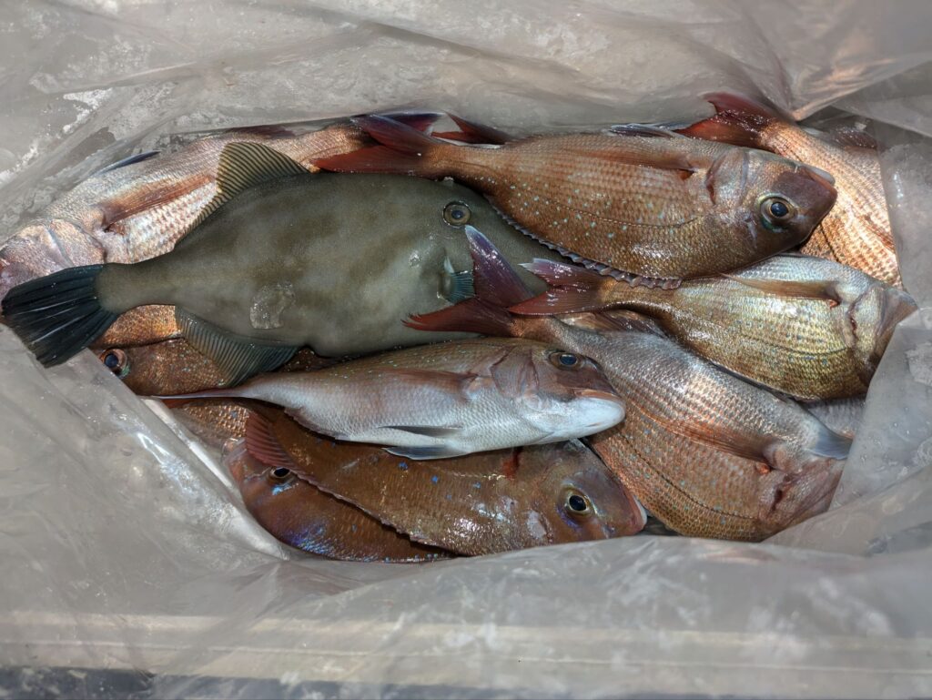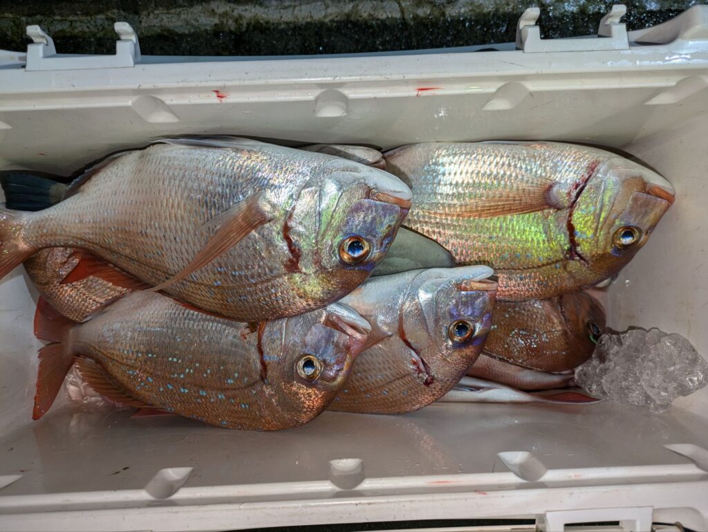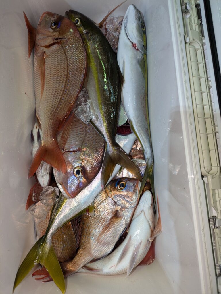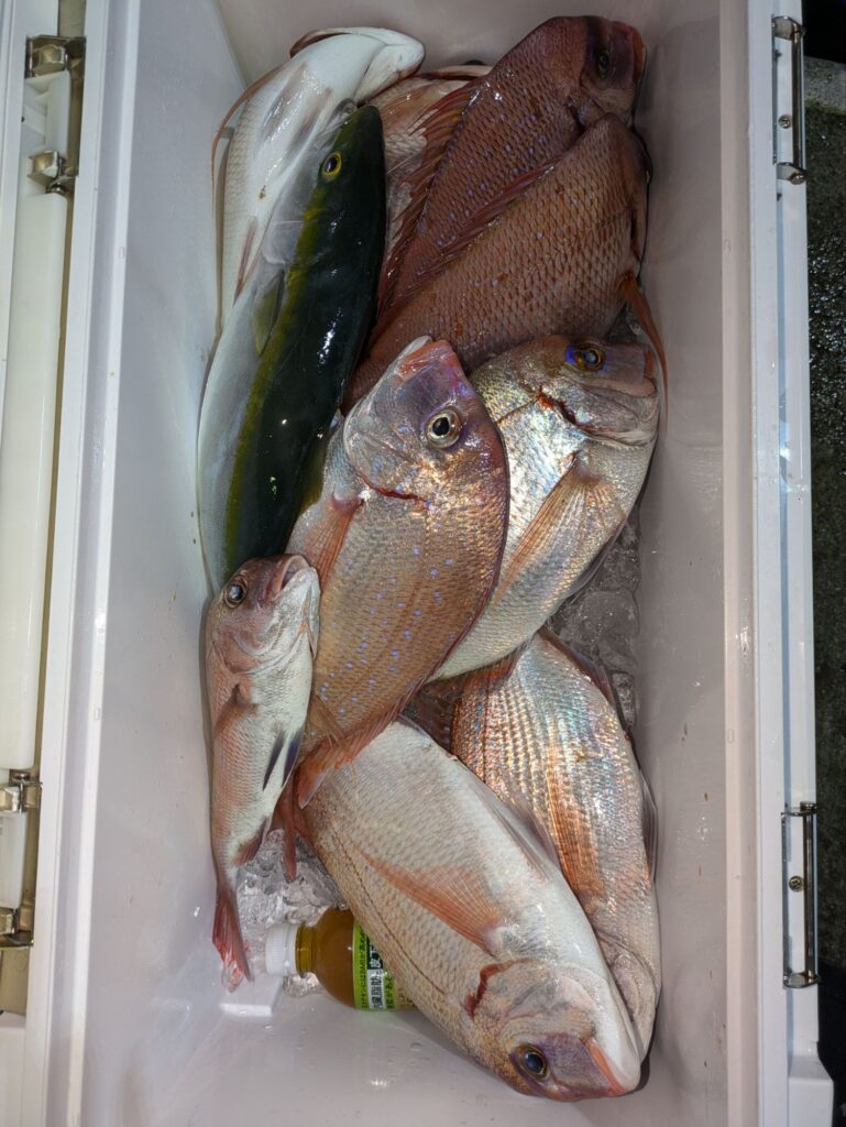 昼からウタセマダイに出船。マダイ主体の釣果で後半行ったポイントは35cm級のチダイがよく釣れカンパチやハマチも混じる。