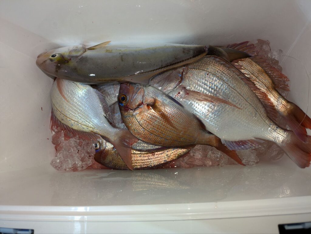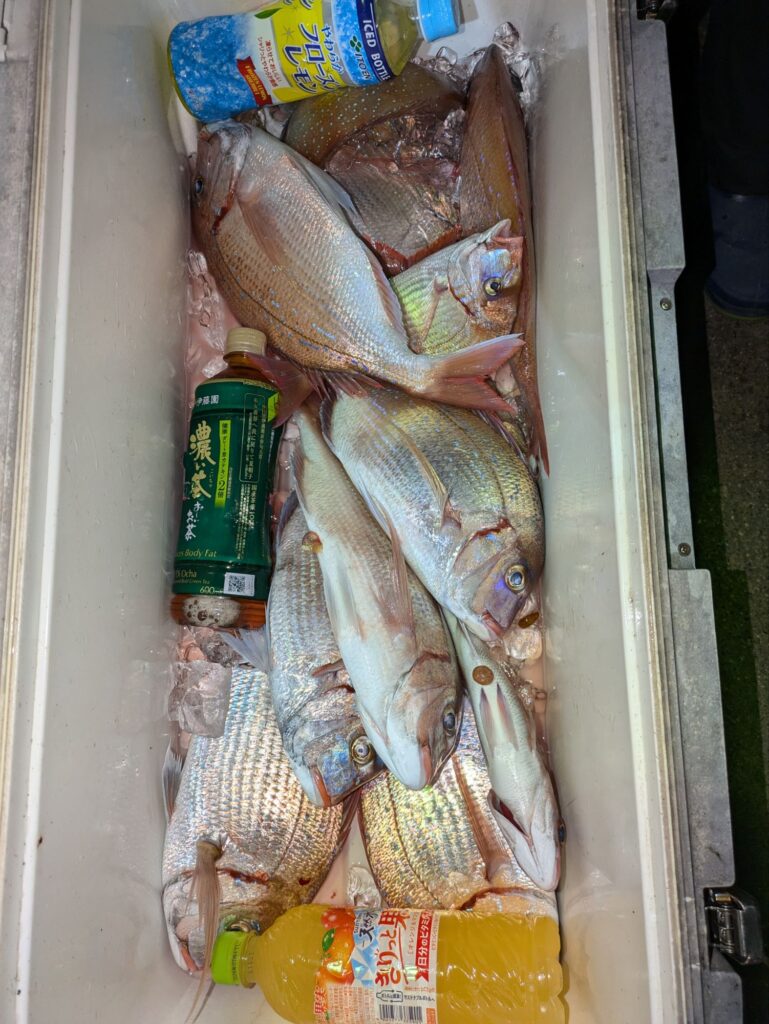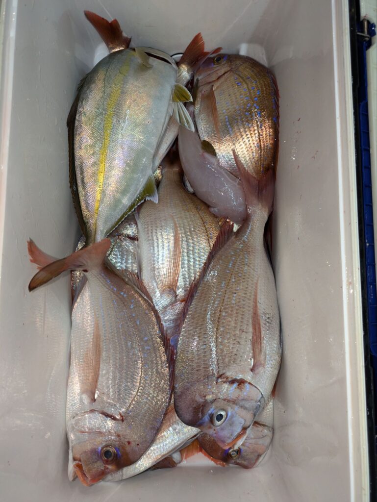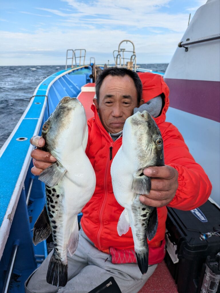 釣果情報 トラフグとウタセマダイ 2025.11.12 朝のトラフグは途中でバレる事が多く一人の方が3本釣って終わりでした。 昼便のウタセマダイも初めは鯛を釣って夕方カンパチ狙いに行く。カンパチも1回回って来て4本食って終わりでした。