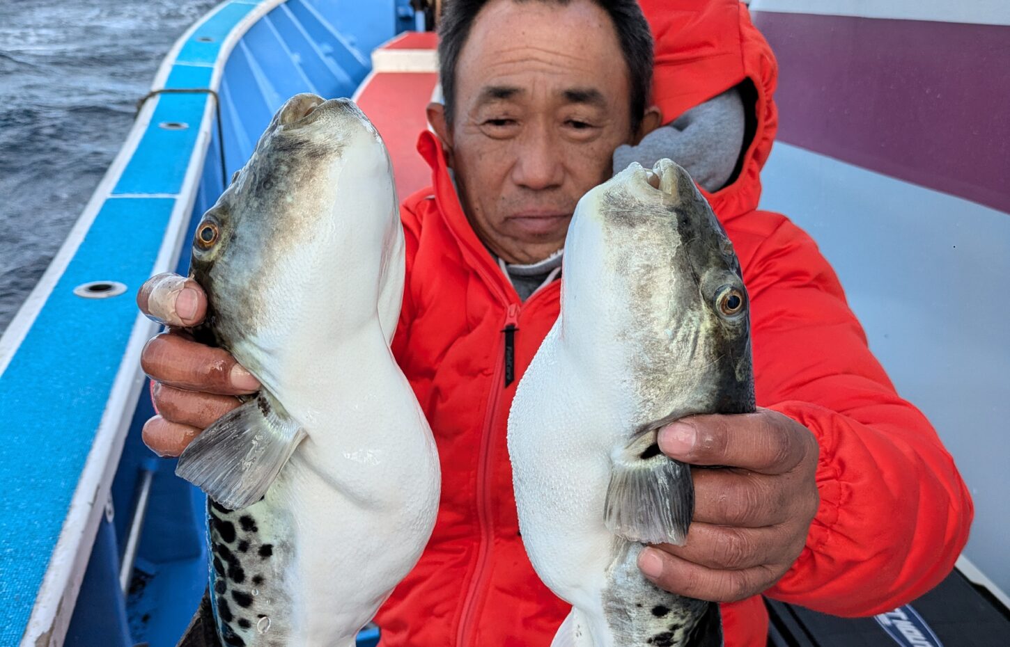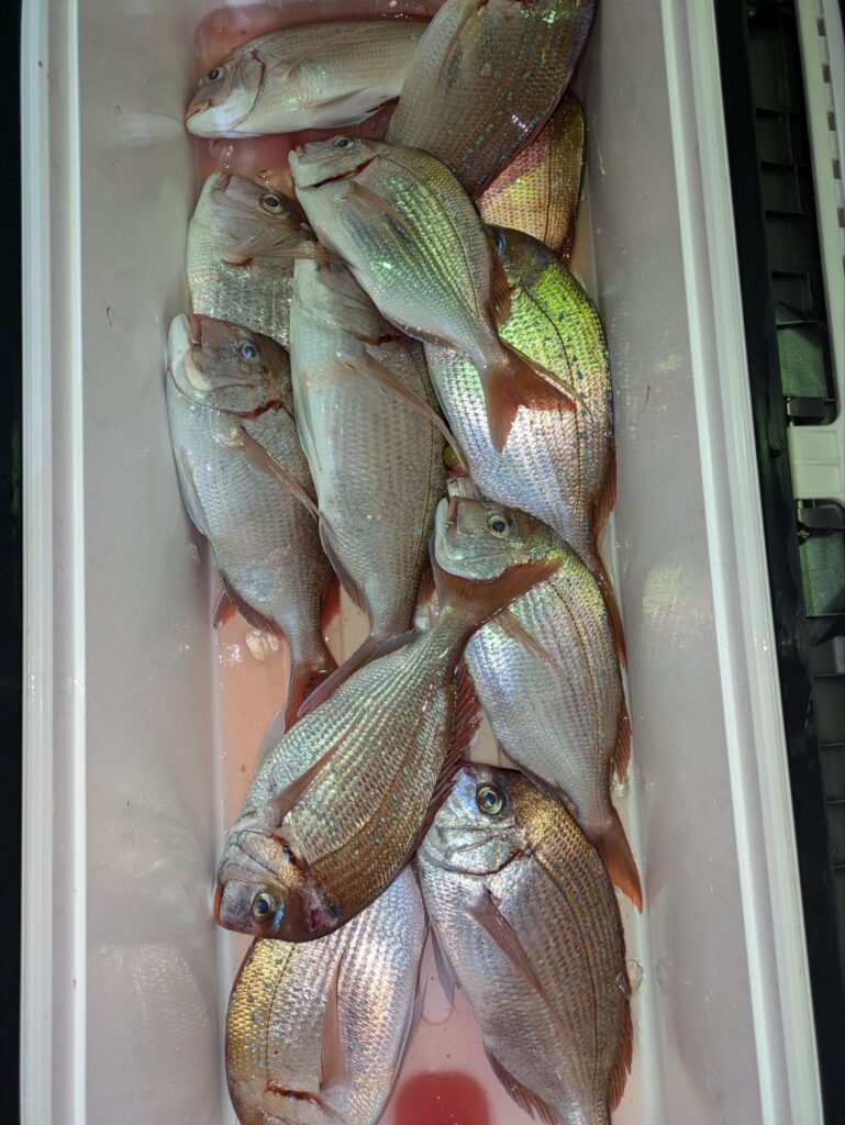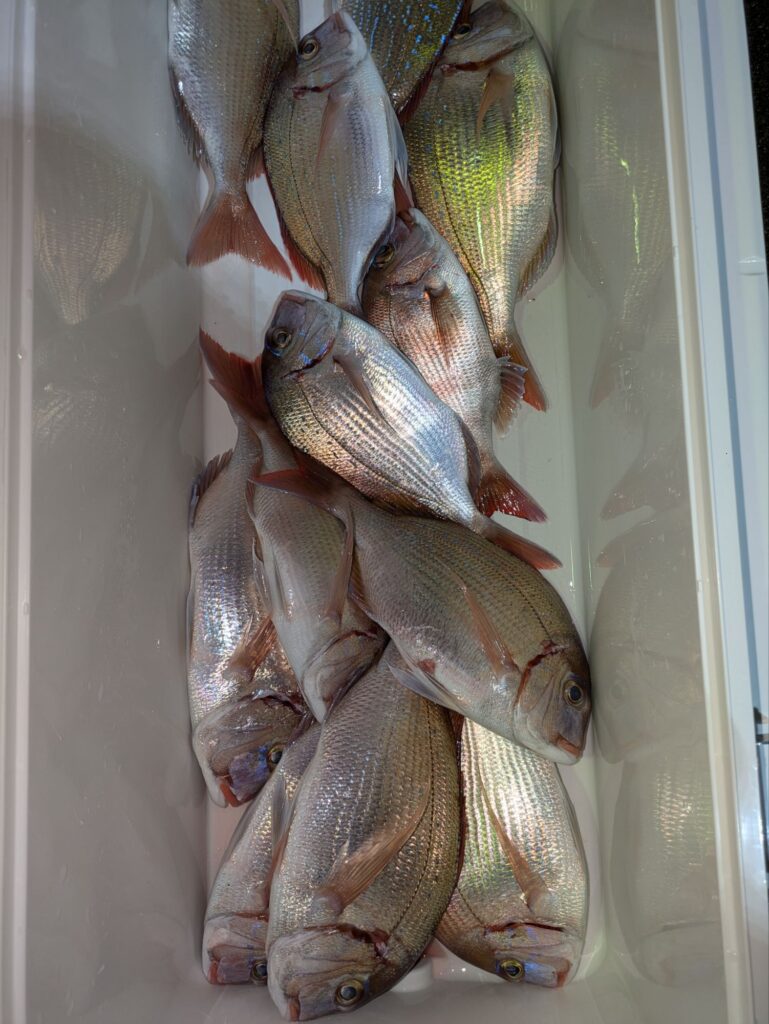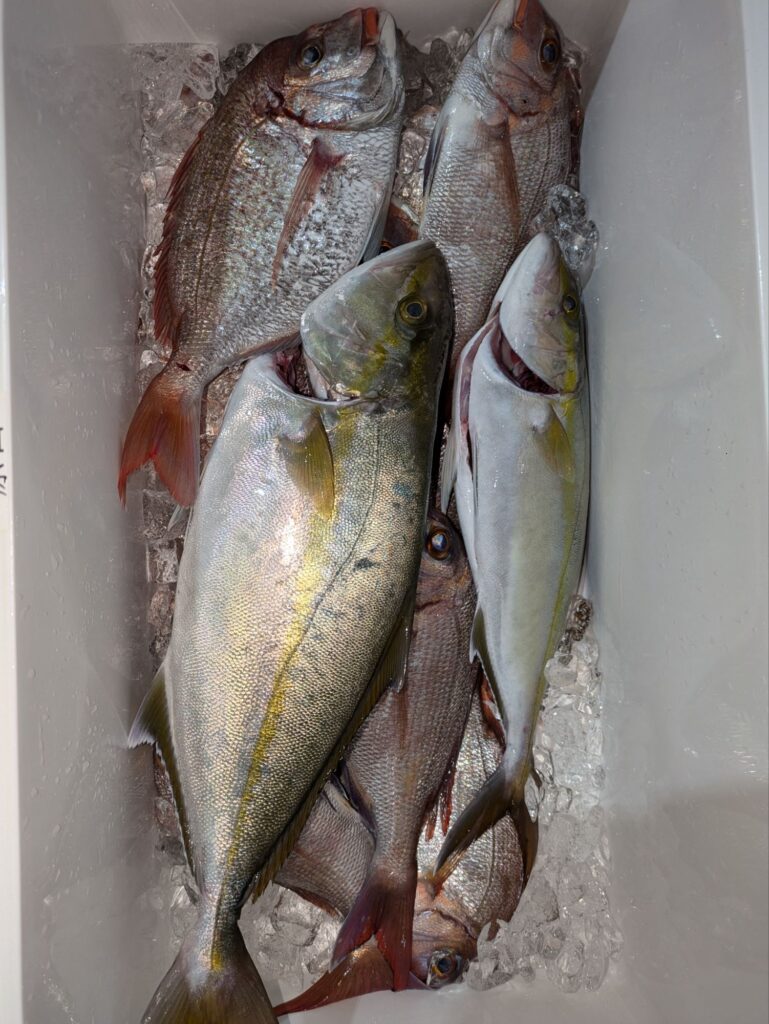 釣果情報 トラフグとウタセマダイ 2025.11.12 朝のトラフグは途中でバレる事が多く一人の方が3本釣って終わりでした。 昼便のウタセマダイも初めは鯛を釣って夕方カンパチ狙いに行く。カンパチも1回回って来て4本食って終わりでした。