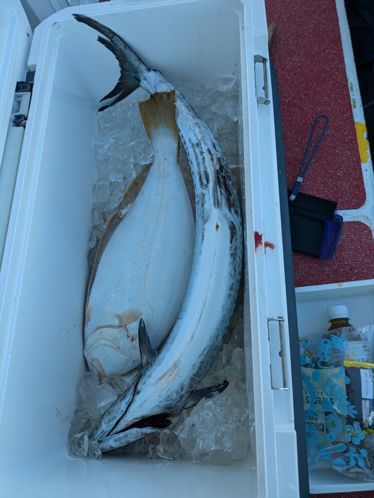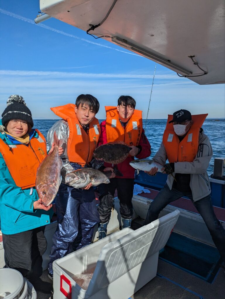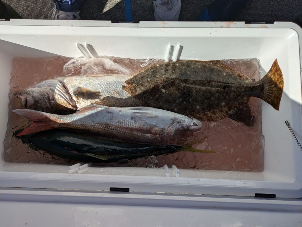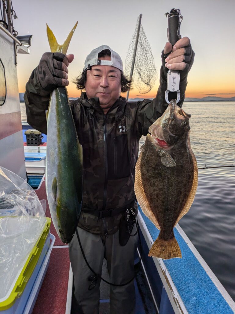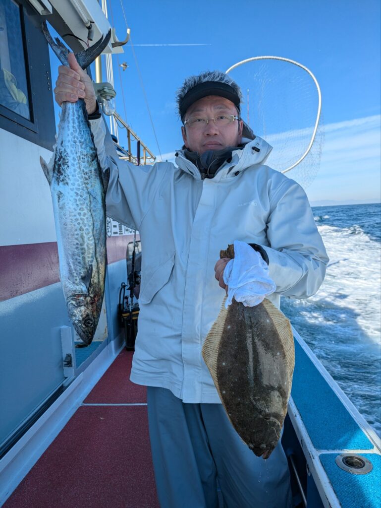 釣果情報 ヒラメ、青物狙い 2025.11.23 イワシの泳がせでヒラメや青物を狙って出船してます。今日も良型ヒラメや青物、マダイ、サワラ、スズキなど釣れました。仕掛けはハリス8号がお薦めです。オモリは60号〜80号です。