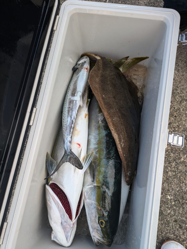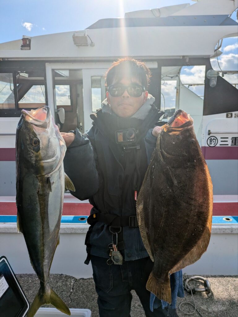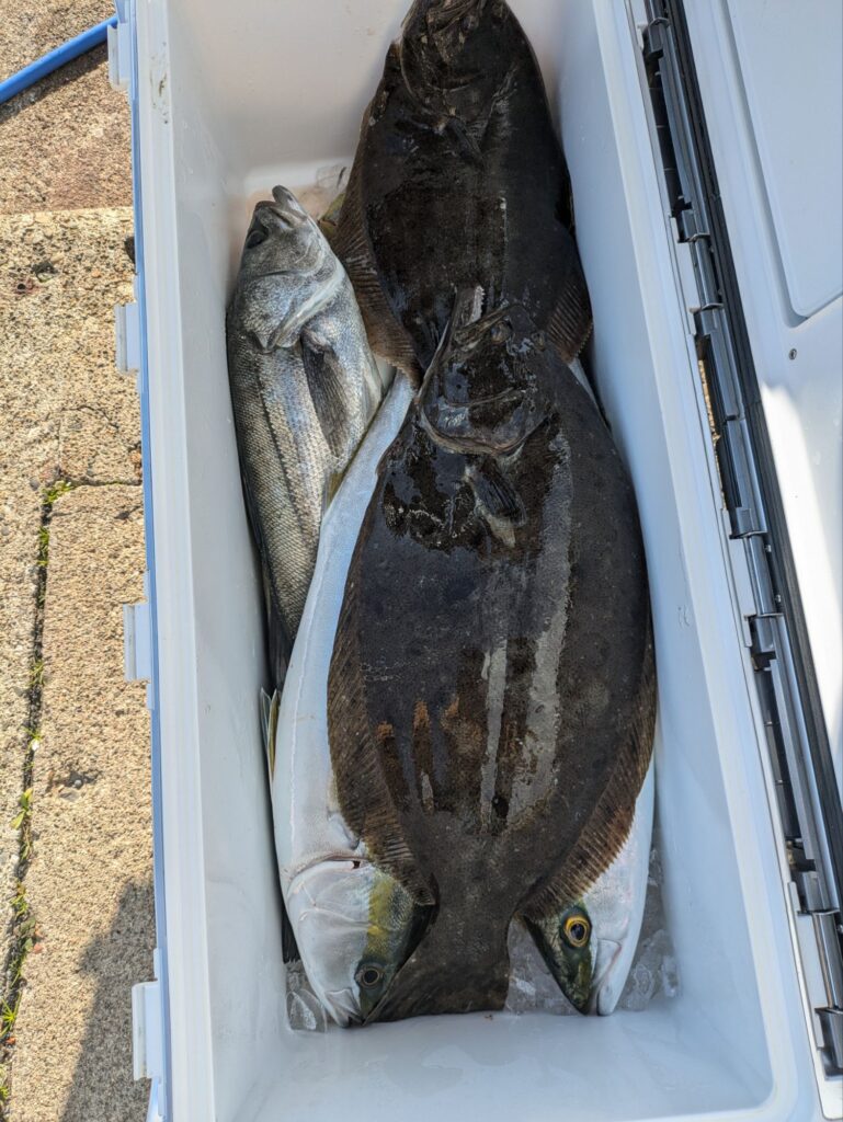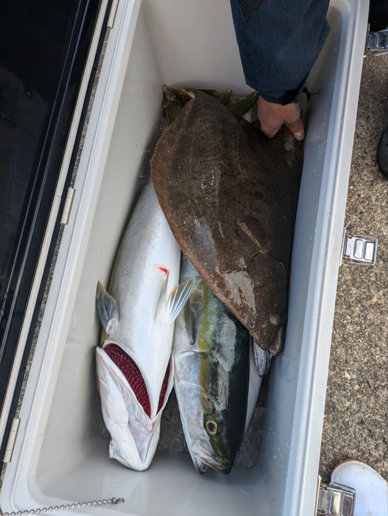 イワシの泳がせでヒラメや青物を狙って出船。鳥羽湾にイワシのベイト反応があり初めはあたりがなかったが1本釣れてから食い気が出て入れ食いの時もあり皆さんたくさん釣れた。バラシやハリス切れも多かった。途中からヒラメを狙いに行って3枚釣れた。
