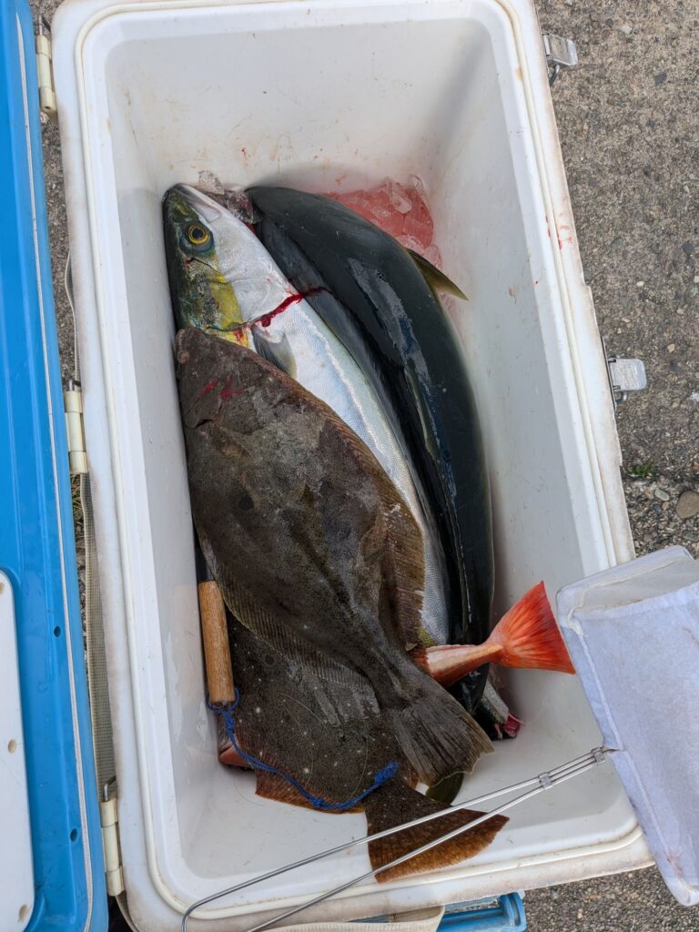 イワシの餌でヒラメ青物狙いに出船。ヒラメや青物がボチボチ釣れて全員釣れました。明日も一便で出船します。空いてます。食いが悪い時は時間を延長してやりますので何か食べ物も少しあったほうが良いかも。発電機が修理中で湯がありませんのであしからず