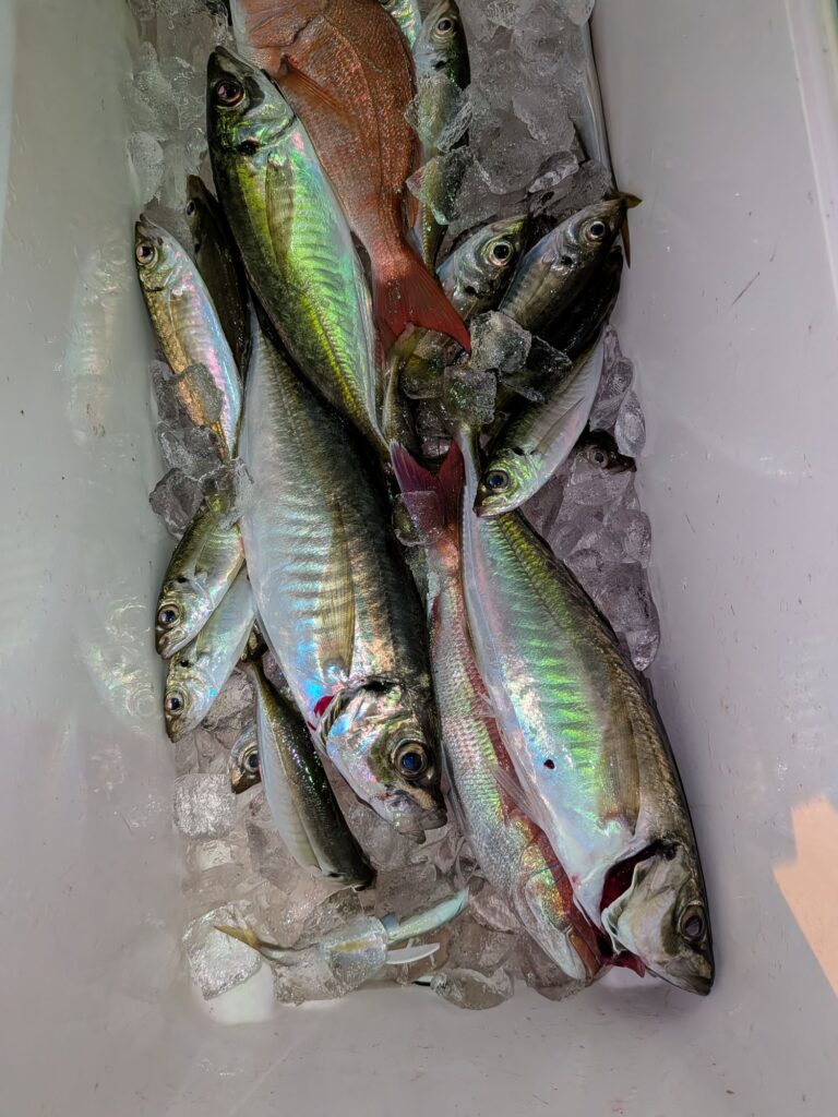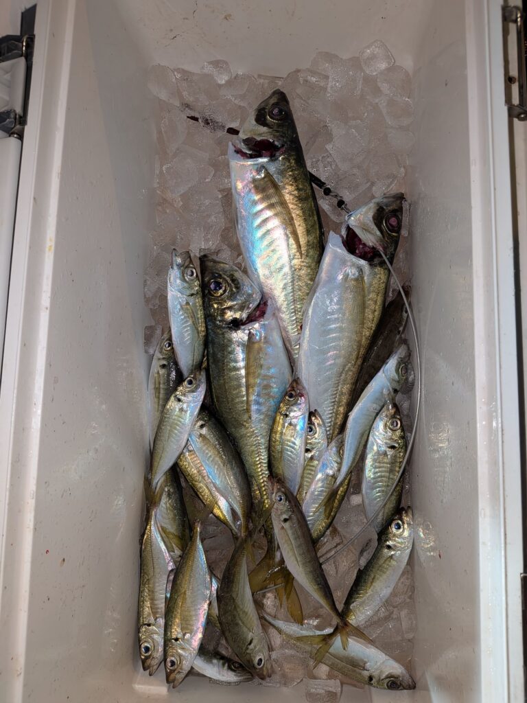 午後便でアジ釣りに出船。潮の流れが速く釣りづらかった。アジの群れあるが小アジがすぐ寄って来て大アジの食いが悪かった。