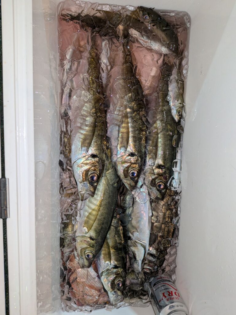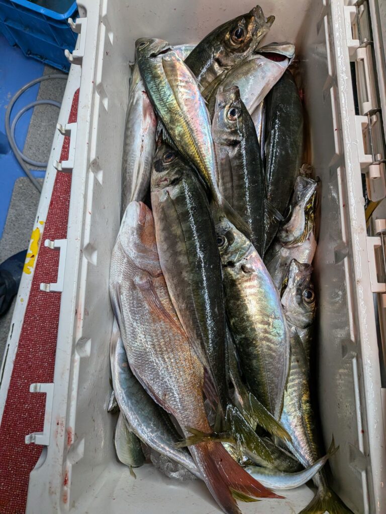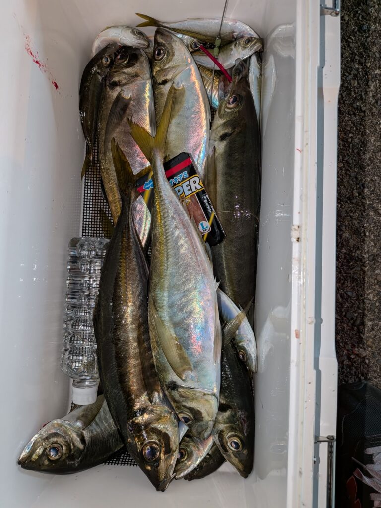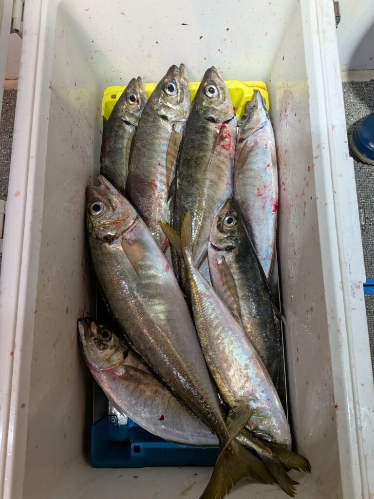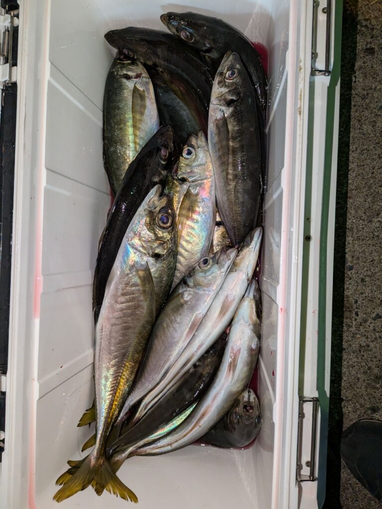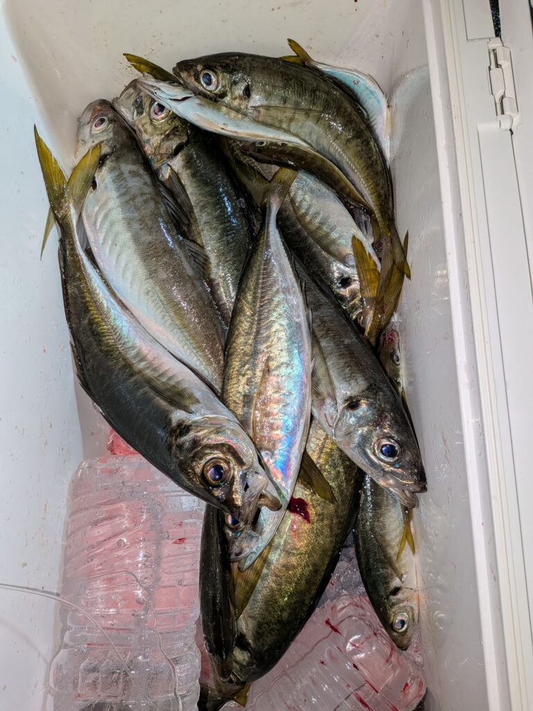 午後からのアジ釣りも初めは小アジが寄って来て大きいのが食わなかったが4時頃からボチボチ釣れ始め多い人で大アジ25匹